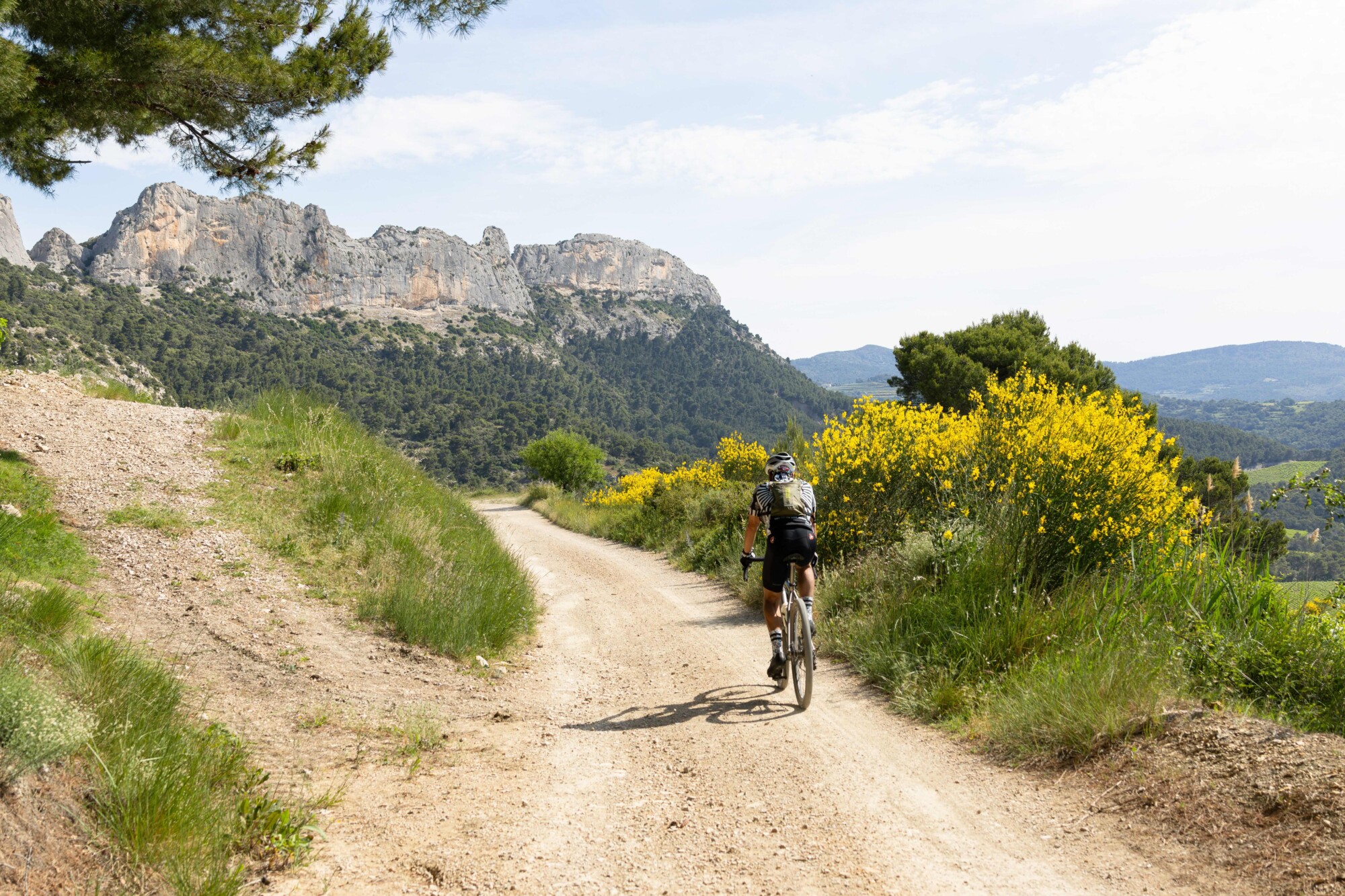 Starting and finishing in Vaison-la-Romaine, the 110km Grande Escapade will take you to discover the Dentelles de Montmirail, which you’ll cross on a variety of trails, with some fast, rolling sections and others that are more playful. You’ll discover the towering cliffs of the Clapis before turning east towards the Comtat plain and its AOC Ventoux vineyards. From hilltop village to hilltop village, between tracks and forest paths, you’ll complete the tour of the Dentelles massif before reaching the hilltop village of Le Crestet. You’ll then join the Ouvèze valley on a rapid descent, followed by a mixture of paths and small bumpy roads. You’ll reach the wild valleys and hills at the gateway to the Baronnies.