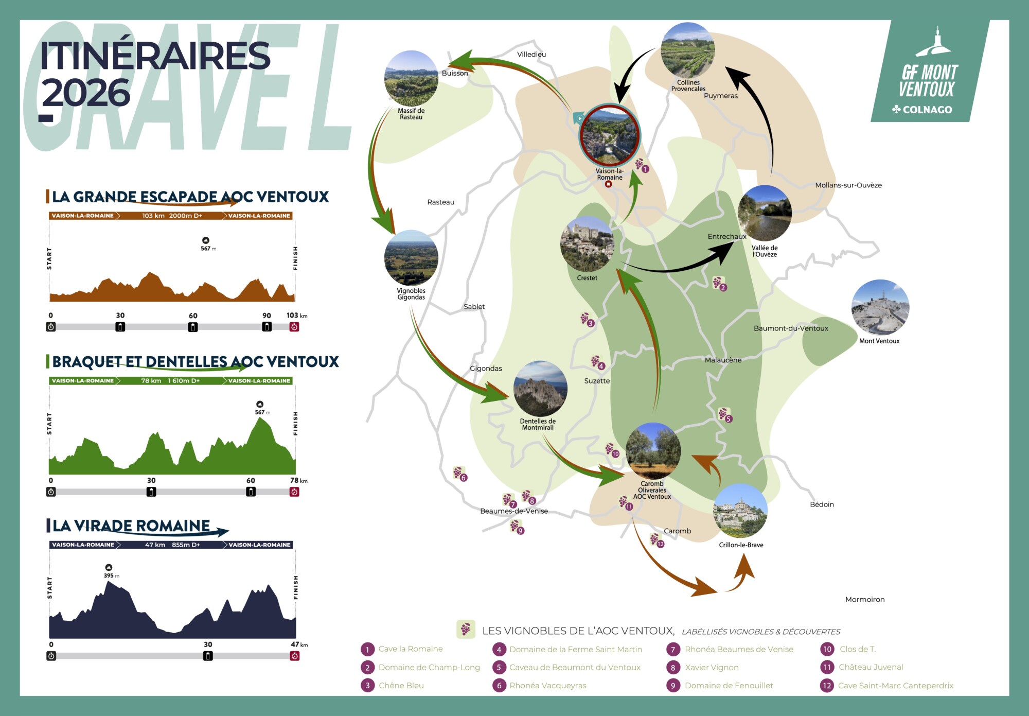 The atmosphere here is typical of the hills of the Drôme, with small roads and farm tracks leading through apricot orchards and fragrant pine forests. You’ll be lucky enough to pass through a few villages hidden away in the middle of this wild environment before returning to Vaison-la-Romaine on some beautiful tracks, still in the midst of the AOC Ventoux vineyards, after 110 km of pure pleasure.